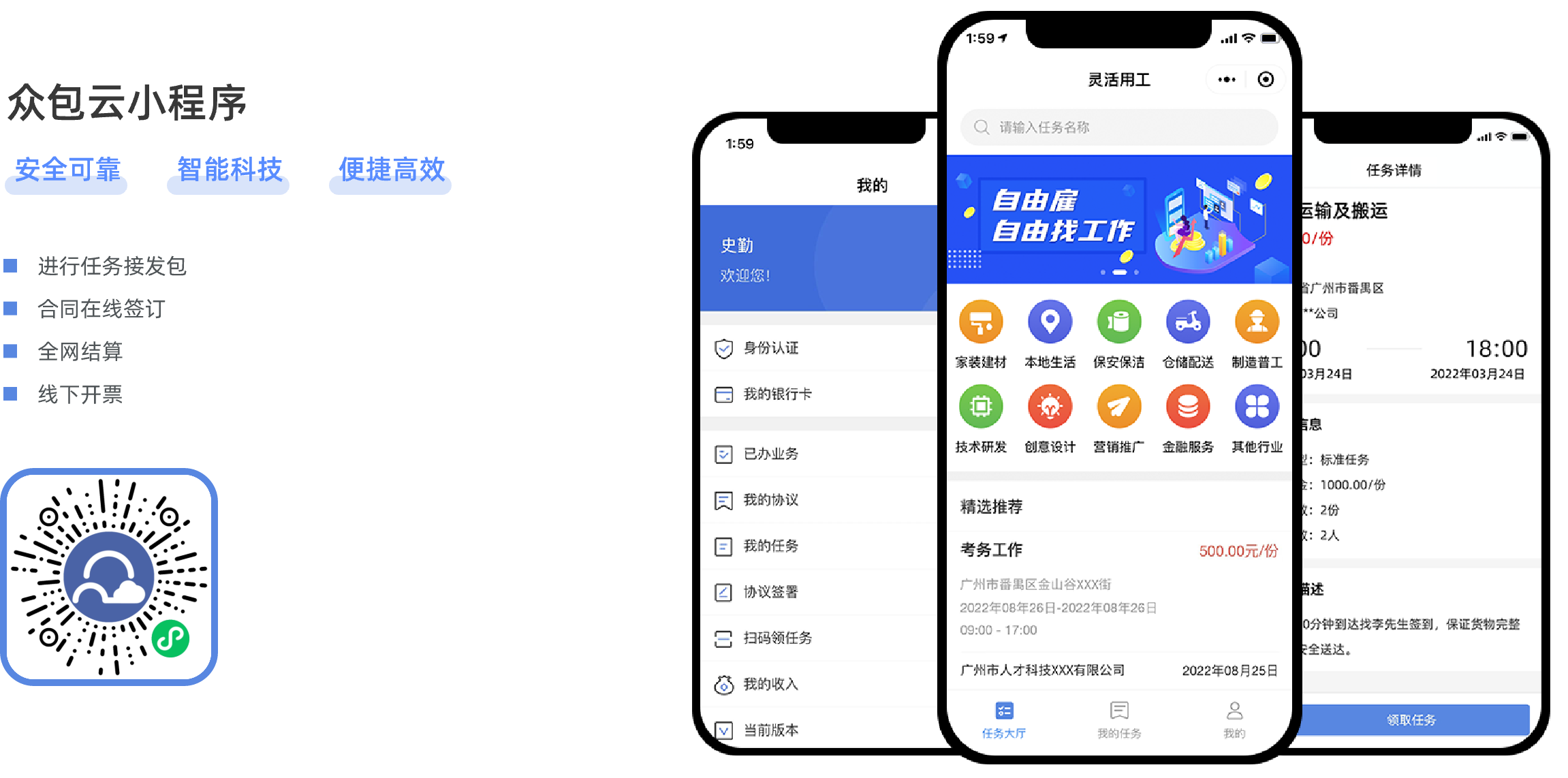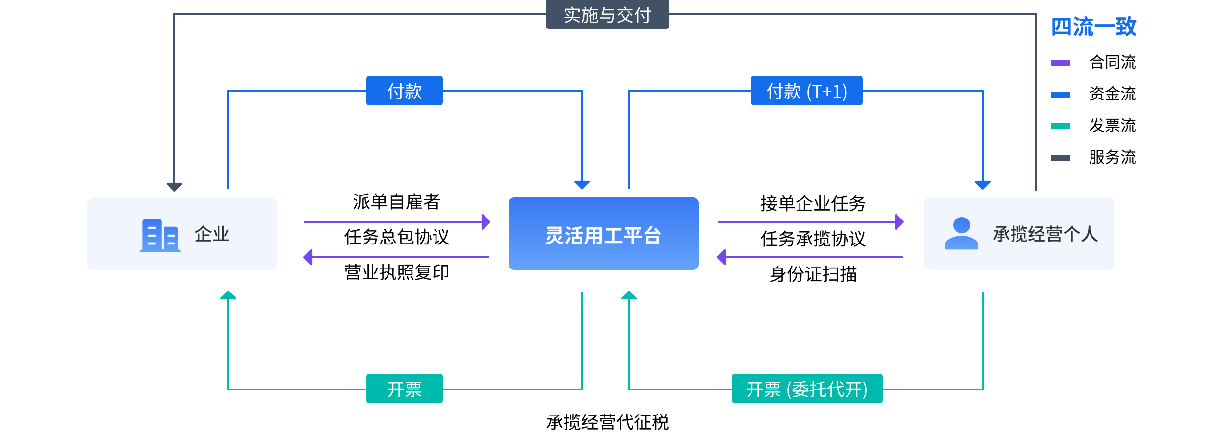 1、提供企业与灵活用工个人间的业务合作服务平台,提供一站式灵活用工服务。 2、进行任务接发包、合同在线签订、全网结算、线下开票,有效地保证了信息流、合同流、资金流、发票流的四流合一,让整个业务体系合法合规地进行灵活用工、结算支付和财税优化。